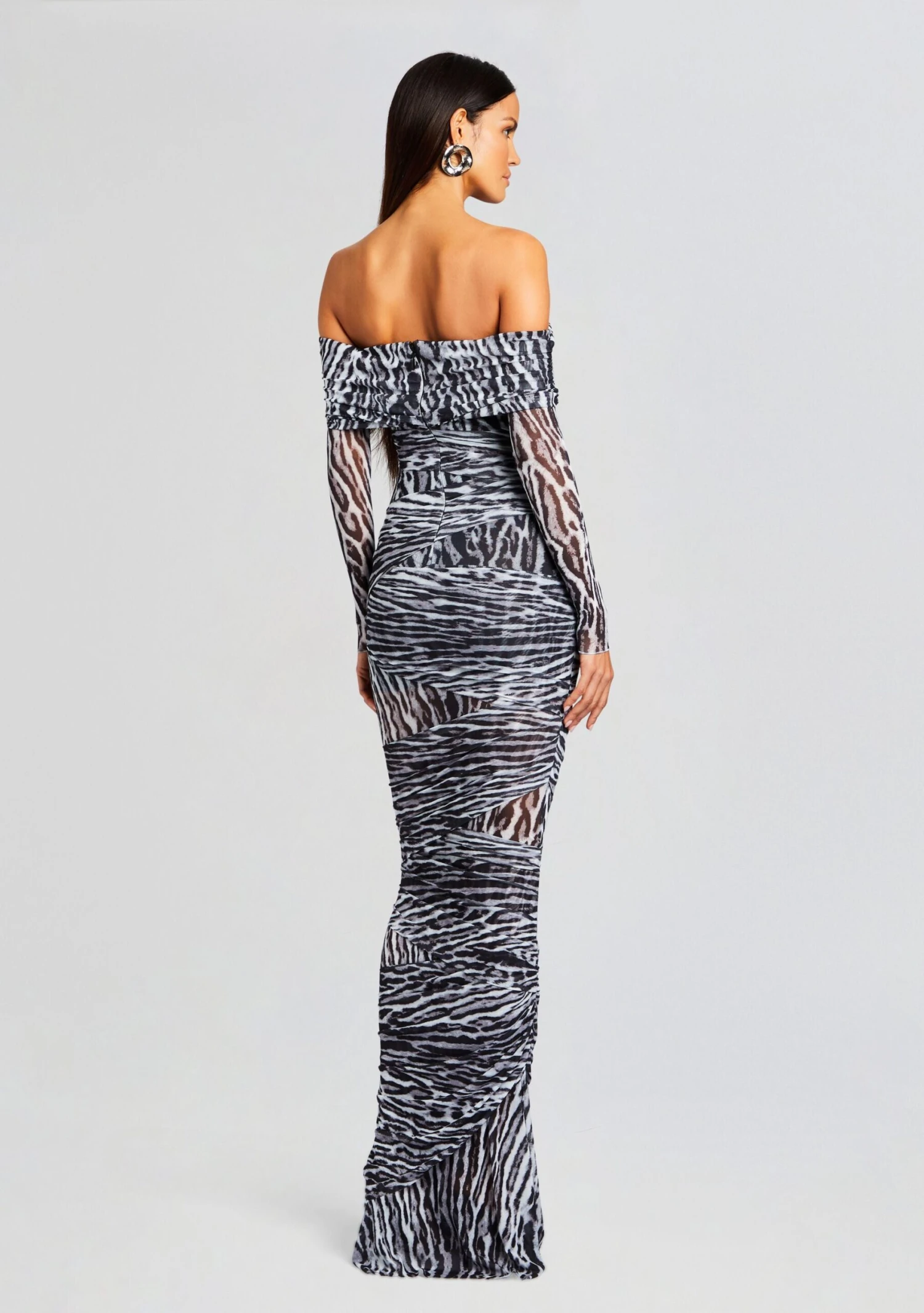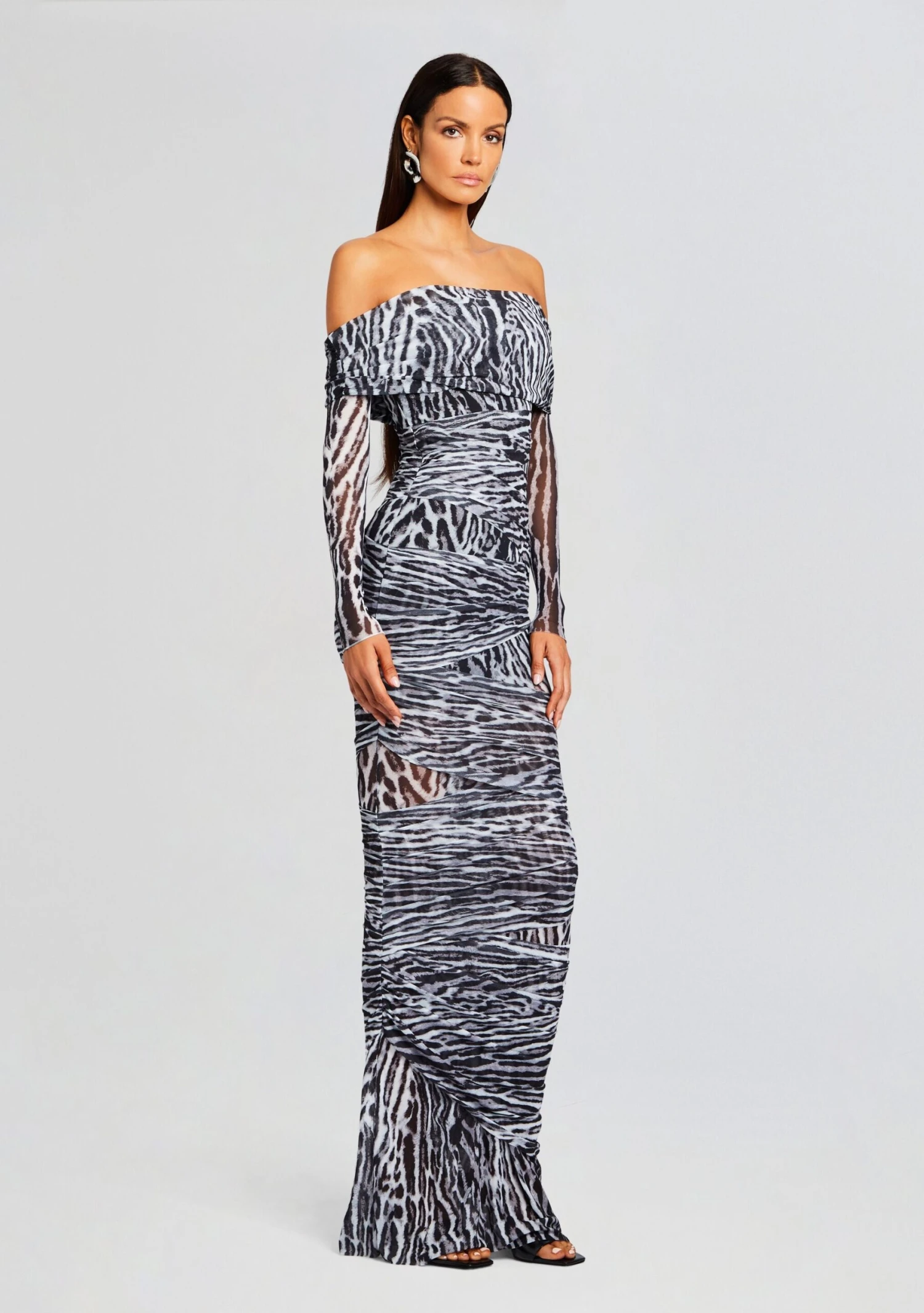 Make a statement in SER.O.YA’s Chanda Gown. This captivating off-the-shoulder animal print maxi dress is designed to make a bold statement wherever you go. This dress is a perfect fusion of daring design and elegant style, making it a top choice for the fashion-forward individuals seeking an eye-catching ensemble. Shown here in Grey Ocelot.