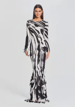The Gemma Dress sparks all the attention, designed with a crystal stone collar that flows elegantly into an asymmetrical silhouette and with an open back. Hand crafted to embody a chain-like effect, the shimmering dress features over 500 meters of chain stone crystal on netting, taking 200 hours to perfect. The dress is finished with a nude lining along the inside. Shown here in White with Silver.
