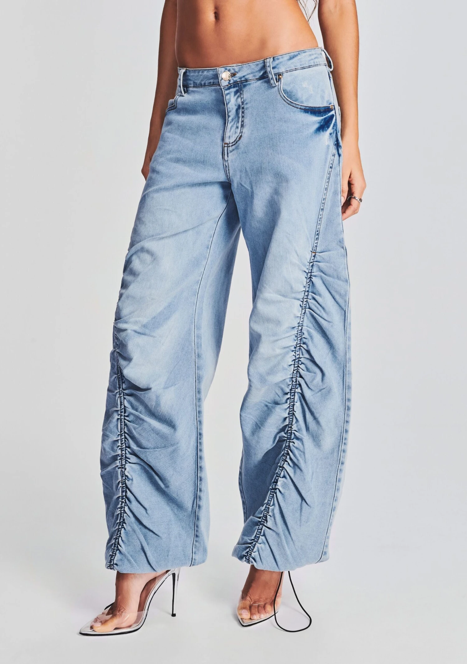 Refresh your wardrobe with our low-waisted Giselli Jean. This apparel essential features a playful drawstring design stitched, adding a casual yet chic flair to this go-to bottom. Pair these pants with our Jetta Chain Bra for a glamorous look. Shown here in Vintage Celeste.