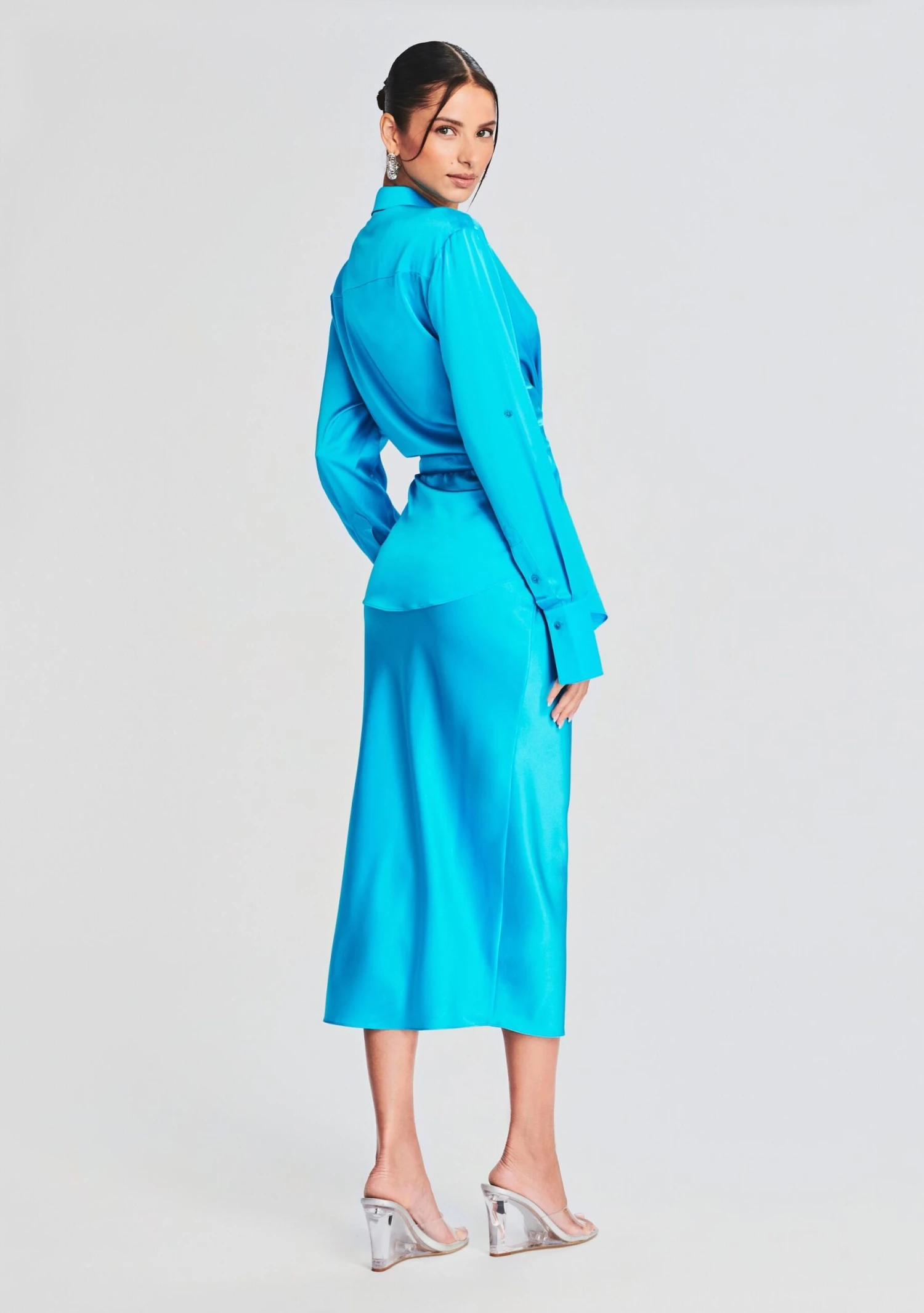 The Karry Shirt by SER.O.YA is a classic wardrobe staple. This stretch-silk top offers a fitted feel, with a cross body button at the side. Final touches include exaggerated cuffs and a rounded hem. Shown here in Turquoise.