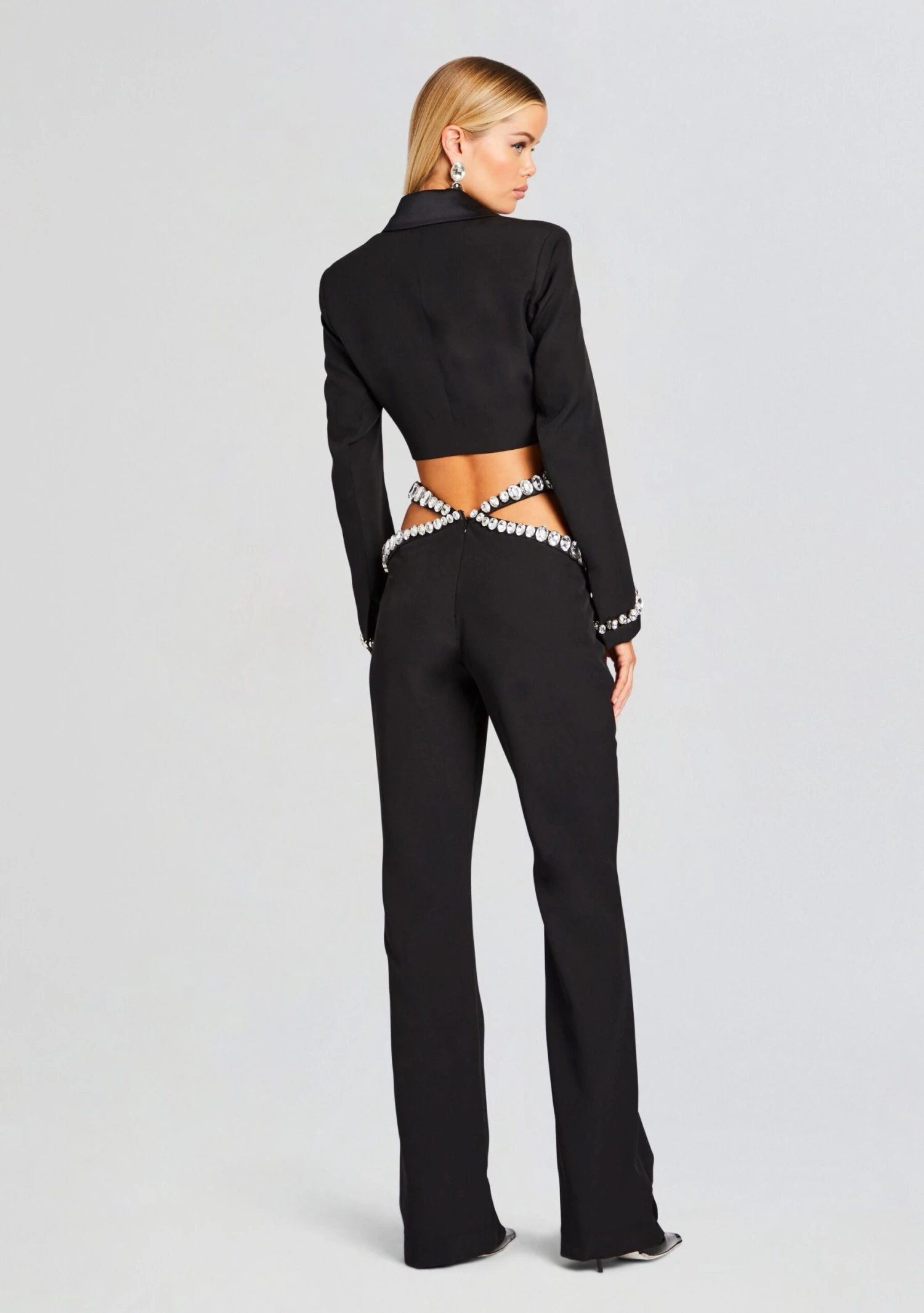 Crafted to catch every eye, our Kaz Pant features carefully placed embellished cut-outs on the waist, adding a playful yet sophisticated touch to your outfit. The flattering design of these pants hugs your curves in all the right places, offering both comfort and style. The combination of embellishments and cut-outs creates a head-turning effect, ensuring you command attention with every step. Shown here in Black/Silver.