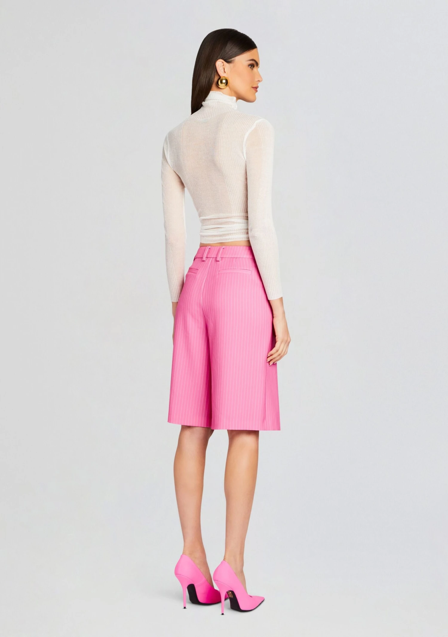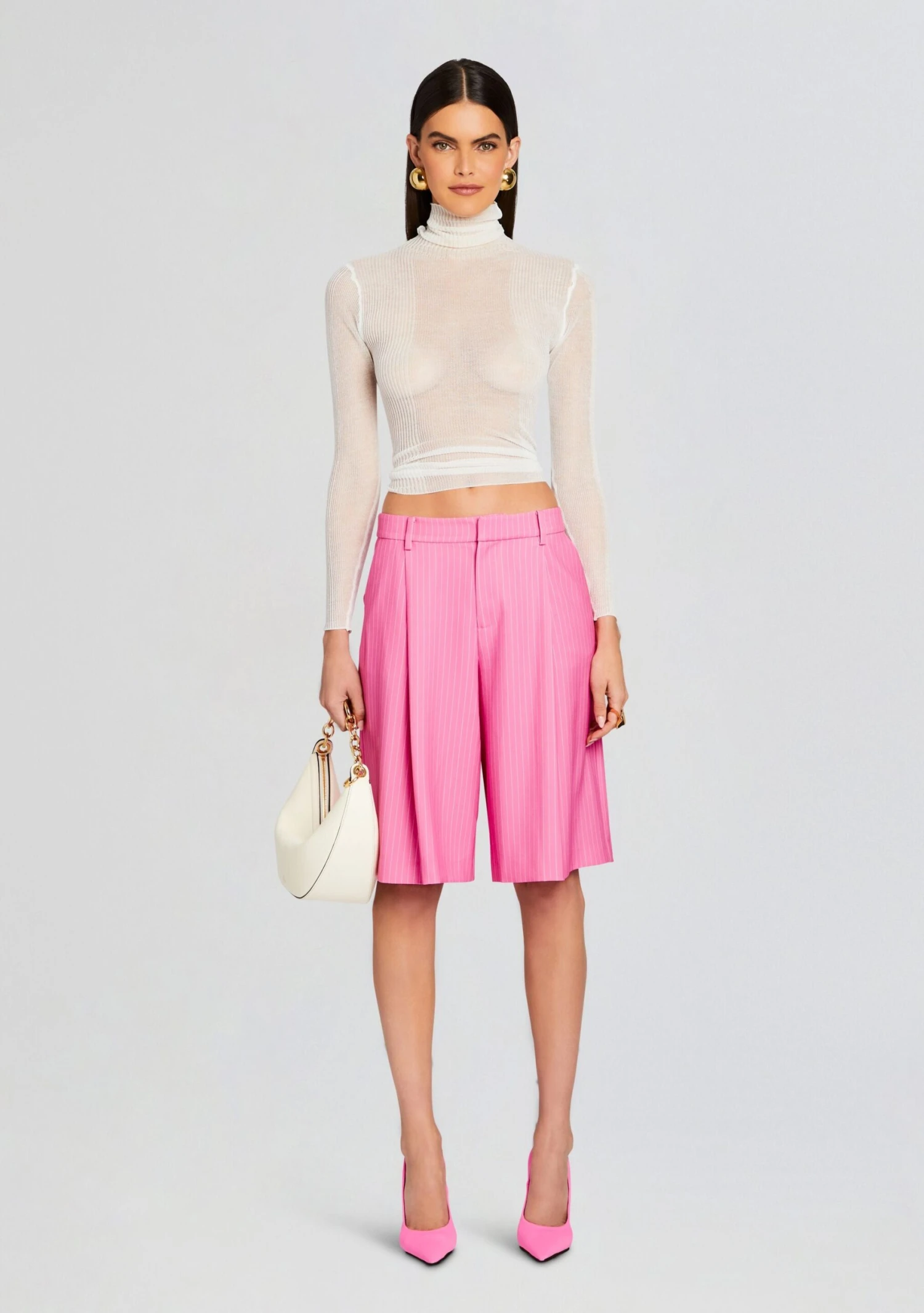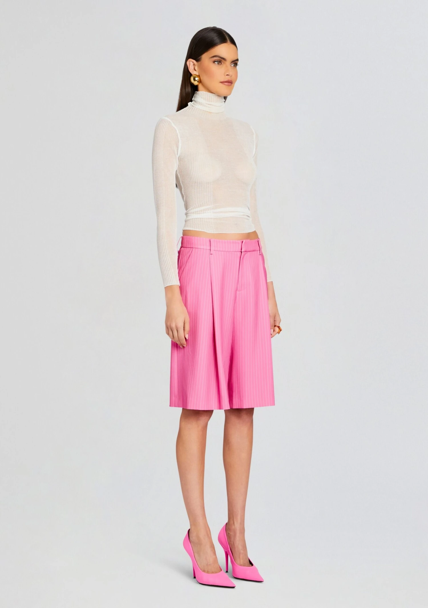 Make a statement in SER.O.YA’s Pearl Short. These trouser styled bermuda shorts feature a button-fly closure, subtle pleats and beltloops giving the perfect amount of edge to any outfit. Shown here in Pink Pinstripe.