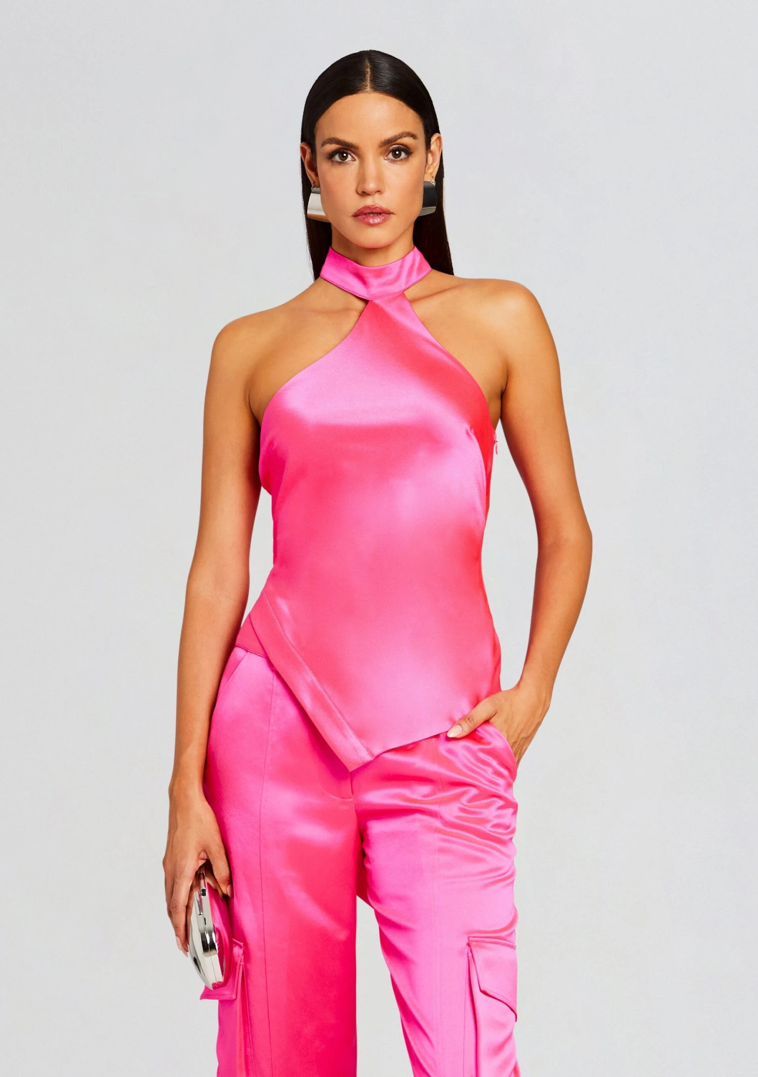 Introducing our stunning Shelly Top- a statement of grace and contemporary allure. The halter neck design adds a touch of classic glamour, while the drape back detail introduces a modern twist. The vibrant pink hue adds a playful and feminine touch, making it an ideal choice for various occasions – from casual outings to chic events. Shown here in Paradise Pink.